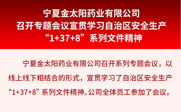 寧夏金太陽藥業有限公司召開系列專題會議,以線上線下相結合的形式,宣貫學習了自治區安全生產1+37+8系列文件精神。公司全體員工參加了會議。 會議宣貫學習了: 自治區黨委 人民政府《…
